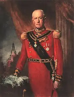 At the outbreak of the war, on 31 July 1914, the German Emperor (Kaiser), Wilhelm II said to him: "I have decided, if the God would grant us victory, to re-establish an independent Polish State".[12][13] Wilhem II further said to him "..an independent Polish state in alliance with which Germany will be, forever secured against Russia".[14][15] Czapski reported the Polish clergy in Posen had received the news "with jubilation" and that the clergy, in their sermons, had urged the Poles to fight against the Russians.[12] He later served in Eastern affairs in the political department of the General Staff.,[16] and he was instructed to promote insurrection in Russian held Poland.[17] Assigned successively to the staffs of Generalfeldmarschall Paul von Hindenburg and field marshal August von Mackensen, he mediated between them and government in Berlin, as well as with the Polish society. He had also been requested to form a German Legion of Poles as Pilsudski had done in Austria, but after his request for similar concessions for the Poles that Pilsudski had achieved, this matter was dropped, and the recruited Poles joined the Pilsudski Legions.[17] After the Battle of Tannenberg, on behalf of the emperor, on 23 December 1914, he delivered the Marshal's Baton to the victorious Hindenburg in Posen (Poznań) castle.[8]