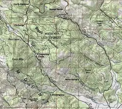 The 3,453 acres (1,397 ha) Boggs Mountain Demonstration State Forest covers the relatively flat top of Boggs Mountain.[21] The California Department of Forestry and Fire Protection (CAL FIRE) purchased the land in 1949.[22] The state bought the land for just $38,700 because it held no timber of commercial value.[18] The 200 acres (81 ha) Boggs Mountain Inner Coast Range Reserve has steeper slopes that have virtually undisturbed vegetation. It is under a conservation easement with the Napa County Land Trust.[23] The Valley Fire of 6 October 2015 burned many of the trees on the mountain.[7]