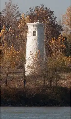 The lighthouse is a white stone tower, located at the south end of Bois Blanc Island near the mouth of the Detroit River where it opens into Lake Erie.[2] It was built by the government of Upper Canada in 1836, in the style of an imperial tower common from the 1830s to the 1860s.[3] Its purpose was to improve naval safety in Lake Erie, on which greater navigation was occurring because of the 1829 completion of the Welland Canal.[3][1] The Legislative Assembly of Upper Canada appointed a group of commissioners, to whom a design with specifications were submitted.[3] Although it is not known who designed the lighthouse, a local legend holds that it was Amherstburg engineer Andrew Kemp, a member of the civil branch of the Royal Engineers.[3] The construction contract was awarded to John Cook of Detroit.[3]