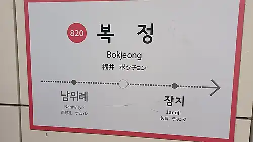 Bokjeong station is a station on Seoul Subway Line 8 and the Suin-Bundang Line. This station has one of the most sophisticated and convenient transfer systems in the Seoul Metropolitan Subway in which the Suin–Bundang Line platform is directly beneath the Line 8 platform. Passengers can transfer between the lines simply by taking one flight of stairs/escalators. However, since the station is situated directly below a major highway interchange with no nearby residential or industrial area, the vicinity of the station has no significant source of passengers, so this station is used mainly as a transfer point.[1]