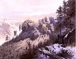 Work continued until 1550. In 1562 the castle, together with Janowice and Miedzianka, became the property of the brothers Hans and Franz Heilmann. Probably at the beginning of the 17th century Daniel Schaffgotsch, the owner of Janowice at that time, ordered further improvements to the castle. Further reconstructions took place as a result of the Thirty Years' War. In 1645 the castle was occupied by the Swedes who, upon leaving in December of that year, set fire to the residential buildings.[1] Since then the castle has remained in disrepair.[1] An interest in tourism in the mid-19th century (in 1824 Frederick William III visited the castle) resulted in its reconstruction in 1848 on the initiative of Count Stolberg-Wernigerode. The castle housed a small Swiss-style inn, built on its old foundations.[1] After World War II, the inn housed a tourist hostel, which fell into disrepair over time. The castle is administered by the Śnieżka Forest Inspectorate.[2] It is a part of the Cultural Park of Jelenia Góra Valley established in 2008.