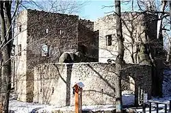 Two granite rocks were used to build the castle, which were connected by stone walls to create a small courtyard.[1] Above them, on the eastern side, a square tower was erected, next to it a house for women, and perpendicularly to it, on the northern side of the walls, on the edge of the slope, a residential building with a basement.[1] Said house measured 20 x 7.8 m, with an entrance accessed directly from the courtyard, its above-ground floors divided into two rooms of similar size.[1] A round chapel was situated on the southern side, and a kitchen and a bakery were located opposite the residential building on the southeast.[1] The castle courtyard included a water cistern.[1]