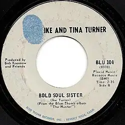 "Bold Soul Sister" is a song by R&B duo Ike & Tina Turner from the album The Hunter. The song features electric blues guitarist Albert Collins.[2] It was released as the B-side to the single "I Know" in October 1969.[3]
