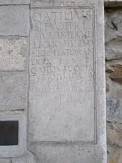 - ^ H Elton 'Frontiers of the Roman Empire', Routledge 2013, 80, gives an alternative translation 'Here lies Quintus Atilius Primus, son of Spurius, of the tribe of Voturina, interpreter of legio XV, centurion of the same, 80 years old. His heirs Quintus Atilis Cositutus, Atilia Quinta freedwoman, Fausta and Martialis placed this