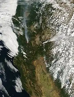 ![]() The small plume of the Boles Fire is visible between snowless Mount Shasta and the plume of the Happy Camp Complex Fire. | |