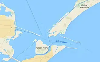 Bolivar Roads is a natural navigable strait fringed by Bolivar Peninsula and Galveston Island emerging as a landform on the Texas Gulf Coast.[4] The natural waterway inlet has a depth of 45 feet (14 m) with an island to peninsula shoreline width of 1.5 miles (2.4 km).
