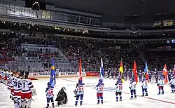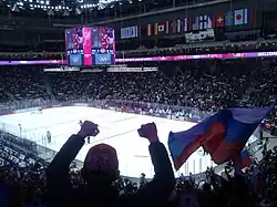 In order to test the arenas built for the Olympics, the Bolshoy Ice Dome served as one of the venues for the 2013 IIHF World U18 Championships.[17] It subsequently held the Channel One Cup from 19–22 December 2013 in final preparation before the start of the Games.[18] As the main venue for the 2014 Olympic ice hockey competition, the Ice Dome hosted most of the preliminary round games and almost all the playoff round matches for the men's tournament, while hosting solely the medal matches of the women's tournament.[19][20] On February 20, it held the gold medal match for the women's tournament, which saw Canada overcome a 0–2 deficit against the United States to tie the game with less than a minute of regulation time remaining, before scoring in overtime to secure their fourth consecutive Olympic gold medal.[21][22] The arena hosted the gold medal game of the men's tournament three days later on 23 February – the final gold medal of the 2014 Games up for contention – in which Canada defeated Sweden by a score of 3–0. In doing so, the Canadian team won an Olympic gold medal outside of North America for the first time in 62 years, became the first team since the Soviet Union in 1984 to finish the tournament with a perfect record,[23] the first team to successfully defend their gold medal since the Soviets in 1988, and the first to do both with the participation of NHL players, which started in 1998.[24]