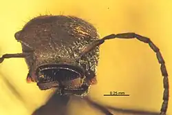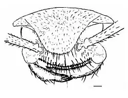 The head is small and wider than long, with a generally triangular outline in dorsal view.[1] The upper surface is thickened into a shield with a curved and raised profile and two elongated processes extend out and slightly forward from the rear of the head.[1] The eyes are either reduced to such a degree that they are not visible, or are possibly lost all together, and no ocelli are visible.[1] The clypeus is small and strongly curved, with the front margin that faces the inner sides of the mandibles covered in 25, 0.01 mm (0.00039 in) long, peg-like setae. Each mandible is curved almost 90˚ with the bases covered by the edges of the clypeus lobes. On the mandible's ends are two teeth, a smaller sub-apical one and a larger apical one with a groove that likely matches the position of the opposite mandible placement when they are closed. The antennae are distinctly 11-segmented, with a curved scape that just reaches the rear margin of the head capsule when reclined.[1]