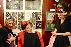 Jane Bom-Bane was born Jane Bayley in Leek, Staffordshire.[9] After moving to and growing up in Coventry, she became lead singer of the Swinging Cats, a Two-Tone band that released one single, "Mantovani."[10] In the 90s, she went solo, playing the harmonium, singing her own songs, and wearing a selection of mechanical hats that "light up and turn and move in various ways."[11] A typical hat takes the form of an animated goldfish bowl.[12] World's Weirdest Restaurants presenter Bob Blumer described her hats as "part genius and part outsider art. What I love about the hats is that they are not highly polished, finely tuned specimens. They are more like little kinetic high school art projects that sit on your head."[3]