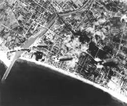 The first raid took place on 31 August 1943, by 45 Consolidated B-24 Liberators of the 376th US Bombardment Group. The target of this attack was the marshalling yard, but this was not hit; the raid was grossly inaccurate and most of the bombs fell all over the town, causing widespread damage and destruction, especially in the city centre. This was the deadliest air raid suffered by Pescara; civilian casualties in this attack have been estimated as 1,600 to 1,900.[1][2][3]