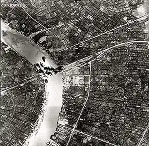 The American bombing campaign gained intensity after the surrender of Germany and victory in Europe. On 4 July 1945 in Nam Dinh province American airplanes hit the steam launch Nam Hai, killing two and hospitalising twenty-seven (with two dying en route); five others were missing. A few days later Haiphong was struck, sinking a dredge and a floating dock. The Japanese moved their ships up the Mekong river from Saigon and Cap St Jacques (now Vung Tau).[2] The United States also dropped leaflets in French, Vietnamese and Japanese, and some were bilingual. They warned people to stay away from railroads, bridges and ferries, and cautioned them against helping the Japanese to repair bomb damage: "Our airplanes will come again, and if you are near the target you will probably be killed by association."[12] After the victory over Japan, on 19 August the denizens of Hanoi broke into the streets and removed the black coverings of the street lamps.[13]