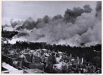 ![]() Bezuidenhout burning, shortly after the bombing, photographed from the tower of the Church of James the Greater, at Parkstraat in The Hague | |||||