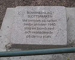 On October 3, 1940, early in the morning, three bombs were dropped over Malmö, in neutral Sweden by an Armstrong Whitworth Whitley bomber of the Royal Air Force. The explosions caused relatively minor damage to nearby buildings. Britain claimed initially not to be involved with the bombing, but convincing evidence led to a recognition of the incident. The bombing raid was said to have been intended against Stettin in Germany (now Szczecin in Poland).