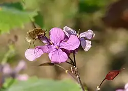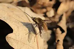 The species sometimes acts as a nectar robber, sometimes as a pollinator;[11] this foraging behavior allows the species to feed on floral nectar, which is an essential part of adult fly diets. This is facilitated by the characteristic long proboscis of the fly, which is horizontally inserted into the flower.[2] This occurs as the fly continues to buzz in the air, sometimes without touching either the anthers or stigma of the flower.[2] However, in some plant species such as Claytonia virginica, bee flies can be effective pollinators.[11][12] The fly also consumes pollen as part of its diet, with considerable differences between the sexes. Males and females visit the same range of flowers as a food source.[13]
