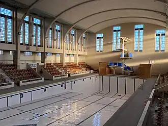 The complex, consisting of pool, private baths, and health suites, is housed within an Art Deco building, designed by the Aberdeen City Architect's Department and the City Engineers Department. Authorship has been ascribed to Alexander McRobbie, who was a young assistant in the Architect's Department and drafted the surviving plans.[8] The structural system is reinforced concrete and masonry. The street elevation and side elevation of the front block are faced in local granite ashlar, the other exterior walls are finished with harling (viz. rough-casting). The relative austerity of the exterior belies drama and elegance of the interior. The stainless steel and glass entry doors open into the ticketing hall, faced with Hopton Wood stone. The sycamore wood-paneled vestibule and corridor lead to a balcony, dramatically overlooking the 120 ft x 40 ft pool. Seating for 1,000 spectators is arranged to either side of the pool. A five-level 10m high reinforced concrete diving tower is situated at the 15ft deep end.