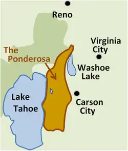 The family lived on a thousand-square-mile (2,600 km2) ranch called the Ponderosa on the eastern shore of Lake Tahoe in Nevada opposite California on the edge of the Sierra Nevada range.[7] The vast size of the Cartwrights' land was quietly revised to "half a million acres" (2,000 km2) in Lorne Greene's 1964 song, "Saga of the Ponderosa". The ranch name refers to the Pinus ponderosa (ponderosa pine), common in the West. The nearest town to the Ponderosa was Virginia City, where the Cartwrights would go to converse with Sheriff Roy Coffee (played by veteran actor Ray Teal), or his deputy Clem Foster (Bing Russell).