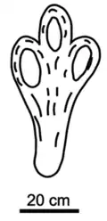 Bonaparteichnium is a dinosaur ichnogenus known from the Candeleros Formation of Neuquén Province, Argentina. It was named by Jorge O. Calvo in a 1991 paper, alongside the other ornithopod ichnogenera Sousaichnium and Limayichnus. The name of the genus honours Argentinian palaeontology José Bonaparte for his contributions to palaeontology in Argentina. The taxon was named for a 60cm footprint of a bipedal ornithopod; the heel of the track is 28cm long, making it 45% of the track. This length, above that expect for an ornithopod foot, along with the width and robustness of the heel, was the distinguishing trait cited in naming the specimen as a new ichnospecies, and is the basis of the species name tali, referring to word "talon" which means heel.[1] In a 1999 paper Calvo would revise his opinion and consider his three ichnogenera to be synonyms. He noted the extreme similarity of the front half of the foot between Bonaparteichnium and Limayichnus, and that the length and size of a heel in a track is dependent on the method of walking; a bipedal animal walking abnormally low to the ground would produce a track such as that used to name Bonaparteichnium even in lack of a large heel as a genuine anatomical feature. He referred to B. tali as a nomen vanum.[2] In a literature review of hadrosaur ichnotaxa, Ignacio Díaz-Martínez and colleagues considered it a nomen dubium as opposed to referring the specimen to Limayichnus, as they also considered that taxon dubious.[3] They noted that Bonaparteichnium can also be considered a taphotaxon, a term proposed by Spencer G. Lucas to refer to invalid taxa who were thought distinct due to taphonomic distortions.[3][4]