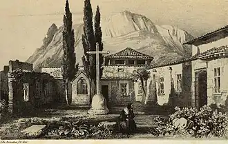 In 1840 Laurens also published a copiously illustrated memoire on Majorca – an artistic travel guide.[4] As preparation he travelled across the whole of the island, in particular visiting the Carthusian monastery in Valldemossa and the cell where George Sand and Frédéric Chopin had wintered before their abrupt departure in February 1839. In his memoire, Laurens describes the cell: Sand's pipe still in the cell; their garden with its oranges, ripening pomegranates and rustic lamp; and the cloister cemetery, a place for evening repose, which he illustrated with a lithograph. Laurens' Souvenirs would later inspire Sand's book Un hiver à Majorque.[3][5]