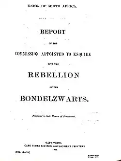 - ^ a b c d e f g h i j k l m n o p q r s t u v w x y z Report of the Commission appointed to enquire into the Rebellion of the Bondelzwarts, Union of South Africa, 1923