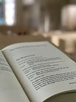 The 1979 Book of Common Prayer[note 1] is the official primary liturgical book of the U.S.-based Episcopal Church. An edition in the same tradition as other versions of the Book of Common Prayer used by the churches within the Anglican Communion and Anglicanism generally, it contains both the forms of the Eucharistic liturgy and the Daily Office, as well as additional public liturgies and personal devotions. It is the fourth major revision of the Book of Common Prayer adopted by the Episcopal Church, and succeeded the 1928 edition.[1] The 1979 Book of Common Prayer has been translated into multiple languages and is considered a representative production of the 20th-century Liturgical Movement.[2][3]: 6 [4]: 4
