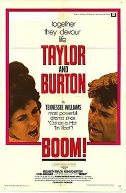 Boom! is a 1968 British drama film directed by Joseph Losey and starring Elizabeth Taylor, Richard Burton and Noël Coward. It was adapted by Tennessee Williams from his own play The Milk Train Doesn't Stop Here Anymore.[1][2]