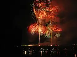 Boomsday's firework display attracted over 325,000 spectators every year.[1] Fireworks were set off from the Henley Street Bridge (to a lesser extent Baptist Hospital and the Gay Street Bridge) and spectators could view the show from the riverfront, hillsides, or on boats from the Tennessee River. In 2006, Boomsday was expanded to a three-day event lasting through Labor Day weekend, causing Knoxville to lose money,[2] and the city reverted to the one-day event in 2007.[1] The fireworks display was choreographed to music with one such selection being Madonna's Lucky Star in which all the bursts were star shaped. The Tennessee Volunteer's fight song with the bursts being the team's colors bursting in front of Neyland Stadium was always a perennial crowd pleaser. Other musical selections included Smoke on the Water from Deep Purple, the theme from Jaws, and Born to Be Wild from Steppenwolf, just to name a few. The "waterfall" on the Henley Street Bridge marked the second half of the show.