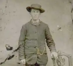 Boone Helm was born in Lincoln County, Kentucky, to Joseph B. Helm (1787–1876) and Nancy Wilcox,[1][2] who moved to Jackson Township, Monroe County, Missouri, when he was still a boy.[3] Helm delighted in demonstrating feats of strength and agility, such as throwing his Bowie knife into the ground and retrieving it from a horse at full gallop.[4] In one demonstration of his contempt for authority, Helm, on horseback, rebuffed a sheriff's attempt to arrest him by walking his horse up the stairs of a courthouse and into the courtroom, while the circuit court was in session, and by verbally haranguing the judge.