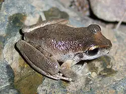 The Booroolong frog (Litoria booroolongensis) is a species of stream-dwelling frog native to the Great Dividing Range in New South Wales, Australia. It is a member of the Hylidae, or the "tree frog" family. The Booroolong frog is classified by the IUCN as an Endangered Species.[1]
