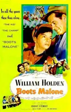 Boots Malone is a 1952 American drama film directed by William Dieterle. It stars William Holden as a down-on-his-luck sports agent and Johnny Stewart as a rich runaway who wants to become a jockey.