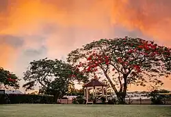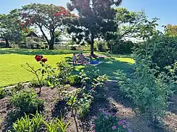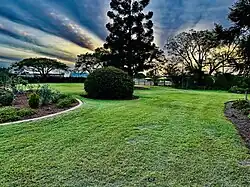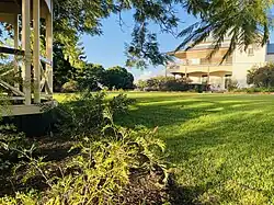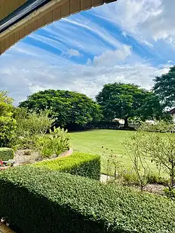 The garden contains some major but all relatively recent trees, most notably cocos palms to the northern garden, mango trees forming a dense screen to the northern adjoining properties and some poinciana and jacaranda trees along the Cothill Road frontage.[1] There was no evidence of any original gardens.