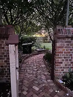 There is an original rear wing constructed of brickwork on the mid southern side of the house. The original Box room flooring has been replaced by concrete ( further evidence of previous severe termite damage). There is evidence of original ceiling hooks, and the box room contains an access manhole and a ladder leading down to an underground cellar approximately 5 by 5 metres (16 by 16 ft) in size. The cellar has wall niches for storage and two metal ventilating ducts leading to the outside air.[1] The original outside access had been bricked up by the convent, apparently to stop children going into the cellar (or the dungeon as they called it).