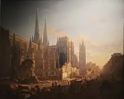 A long series of renovations and reconstructions began in 1803 and continued throughout the century. The most ambitious reconstructions were carried out by Paul Abadie, best known as the architect of the Basilica of Sacré-Cœur in Paris, and a student of Eugène Viollet-le-Duc. The later constructions in front of the north side of the nave in Bordeaux were removed in 1866, making that part of the cathedral more visible. In 1862 Abadie proposed to build new sacristies to replace the old cloister, much larger than the original sacristies. Abadie's plan was opposed by the Bordeaux archeologist Leo Drouyn, who felt that Abadie's changes were based more on Abadie's imagination of the Gothic style than the historic reality of the original building. Drouyn insisted on a more strict recreation of the medieval Bordeaux style. In the end, however, the version of Abadie prevailed.[5]
