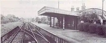 The station building was constructed of corrugated iron on steel framing and stood on a short brick wall. Extra traffic during the First World War led to the extension of the station and the addition of a wooden canopy on its platform side. The station also had a small engine shed which was used in the line's early days for overnight stabling of engines. The shed was later to be damaged by an engine running through its rear, and it was left afterwards to become derelict. Eleven railway cottages were constructed by the London and South Western Railway near the station to accommodate staff: all were either semi-detached or terraced except no. 8 which was the stationmaster's residence. A small wooden signalbox located at the approach of the station completed the layout.[1]