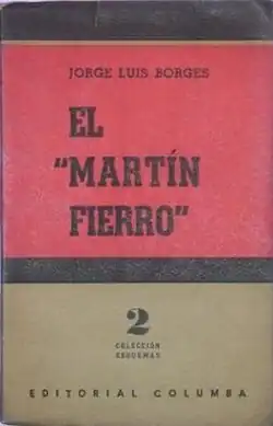Borges on Martín Fierro concerns Argentine Jorge Luis Borges's comments on José Hernández's nineteenth-century poem Martín Fierro. Like most of his compatriots, Borges was a great admirer of this work, which he often characterized as the one clearly great work in Argentine literature. Because Martín Fierro has been widely considered (beginning with Leopoldo Lugones's El Payador, 1916) the fountainhead or pinnacle of Argentine literature, Argentina's Don Quixote or Divine Comedy, and because Borges was certainly Argentina's greatest twentieth-century writer, Borges's 1953 book of essays about the poem and its critical and popular reception–El "Martín Fierro" (written with Margarita Guerrero)—gives insight into Borges's identity as an Argentine.