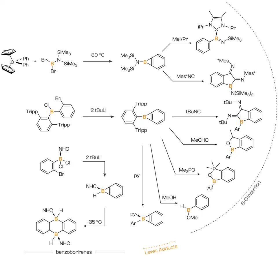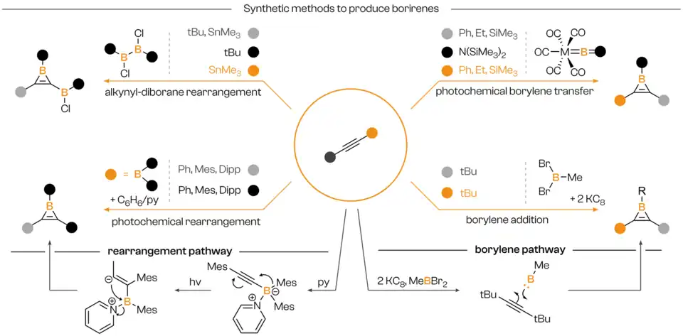 - ^ a b c Wang, Junyi; Ye, Qing (2024-02-21). "Borirenes and Boriranes: Development and Perspectives". Chemistry – A European Journal. 30 (11): e202303695. doi:10.1002/chem.202303695. ISSN 0947-6539. PMID 38085103.