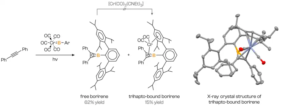 - ^ Braunschweig, Holger; Herbst, Thomas; Rais, Daniela; Seeler, Fabian (2005-11-18). "Synthesis of Borirenes by Photochemical Borylene Transfer from [(OC) 5 MBN(SiMe 3 ) 2 ] (M=Cr, Mo) to Alkynes". Angewandte Chemie International Edition. 44 (45): 7461–7463. doi:10.1002/anie.200502524. ISSN 1433-7851. PMID 16231387.
