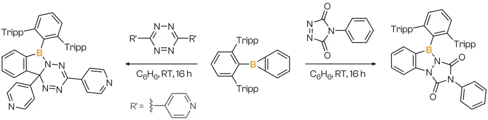 - ^ Sindlinger, Marvin; Biebl, Sonja; Ströbele, Markus; Bettinger, Holger F. (2024). "Formal (2+2) ring expansion prevails over (4+2) cycloaddition of a kinetically stabilized benzoborirene with reactive cycloaddends". Chemical Communications. 60 (73): 9986–9989. doi:10.1039/D4CC02888K. ISSN 1359-7345. PMID 39175434.