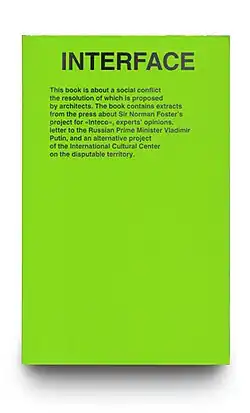 This book is about architects' solutions to a social dispute. The book contains extracts from publications on Norman Foster's projects for the "Inteco" development company, the opinions of experts, open letters to the Russian Prime Minister Vladimir Putin and architect Norman Foster, and an alternative project for an International Culture Center on the disputed territory.