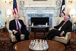 After Theresa May became leader of the Conservative and Prime Minister, Johnson was appointed as Secretary of State for Foreign and Commonwealth Affairs on 13 July 2016.[5] Johnson's appointment was criticised by some journalists and foreign politicians due to his history of controversial statements about other countries and their leaders.[6][7][8] Former Prime Minister of Sweden Carl Bildt said "I wish it was a joke", and French Foreign Minister Jean-Marc Ayrault stated: "I am not at all worried about Boris Johnson, but ... during the campaign he lied a lot to the British people and now it is he who has his back against the wall" as the UK tries to negotiate its future relationship with EU.[9] Conversely, former Prime Minister of Australia Tony Abbott welcomed the appointment and called him "a friend of Australia".[8] A senior official in the US government suggested that Johnson's appointment would push the US further towards ties with Germany at the expense of the Special Relationship with the UK.[10]