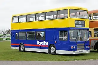 Boro'line was launched with a bold new livery, designed by Best Impressions, who would later go on to design the last independent Maidstone & District livery.[2] The livery consisted of a blue lower and yellow upper base, with white Boro'line logo, red Maidstone strapline and line, with a silver skirt.[9] From 1976 until well after the launch of Boro'line, vehicles in Maidstone could be seen in a variety of liveries, with some retaining either old Maidstone liveries, or the liveries in which they arrived in.[1] Some ochre vehicles only received a yellow front and Boro'line logos, or blue and yellow base with piecemeal detail application. The use in service of many hired or demonstration vehicles caused many other liveries or white buses with Boro'line logos to be used in service.