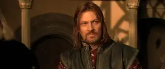 In Peter Jackson's The Lord of the Rings film trilogy, Boromir is played by Sean Bean. His line "One does not simply walk into Mordor" became famous enough for Bean to comment that the "one does not simply" meme (with variant endings) would "probably be my unintended legacy".[14] In a departure from the structure of Tolkien's book, Boromir's death is shown at the end of The Fellowship of the Ring (2001), instead of being related at the beginning of The Two Towers.[15][T 12]