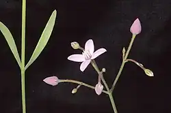 Boronia dichotoma is an erect slender herb or shrub that grows to a height of about 70 cm (28 in) with slender branches. The leaves are glabrous, narrow oblong to elliptic or egg-shaped, 15–50 mm (0.59–2.0 in) long, the upper leaves almost cylindrical in shape. The flowers are arranged in open, branched groups on the ends of the branches. Each flower is on the end of a thin pedicel with small bracts and bracteoles at the base. The pedicels have sticky glandular hairs. The four sepals are red, egg-shaped, about 3 mm (0.1 in) long and fall off as the fruit develops. The four petals are pink, elliptic, 7–11 mm (0.3–0.4 in) long and glabrous. The eight stamens are hairy on their outer edges and the stigma is small. Flowering occurs from August to December.[2][3][4]