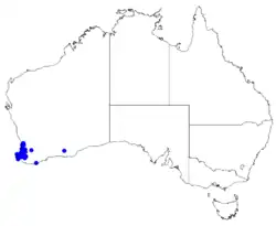 This boronia grows in winter-wet areas from near Perth to the Margaret River in the Jarrah Forest, Swan Coastal Plain and Warren biogeographic regions.[2][3]