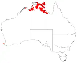 Boronia lanuginosa is found in Western Australia, the Northern Territory and Queensland.[3] However, the occurrence records show this as an essentially Top End species.[8] It is found in the IBRA regions of Victoria Bonaparte,[5][4] Arnhem Coast, Arnhem Plateau, Central Arnhem, Daly Basin, Darwin Coastal, Gulf Coastal, Gulf Fall and Uplands, Gulf Plains, and Pine Creek.[4] It grows on sandstone and sand, in gullies and creekbeds, and in woodland and forest.[5]