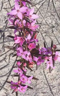 The flowers are pale to bright pink, rarely white, and are arranged in groups of up to 35, but usually 3 to 6 in leaf axils. The groups are on a peduncle 1–10 mm (0.04–0.4 in) long, each flower on an individual stalk a further 6–11 mm (0.2–0.4 in) long. The sepals are egg-shaped to triangular, 3–4.5 mm (0.1–0.2 in) long and the four petals are 5–12 mm (0.2–0.5 in) long. Flowering occurs in spring and early summer and is followed by the fruit which is a follicle, 4–5 mm (0.16–0.20 in) long.[2][3][4]