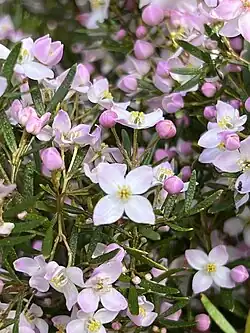 Boronia muelleri, commonly known as the forest boronia or pink boronia,[2] is a flowering plant that occurs in forest, woodland and heath in Victoria and New South Wales in Australia. It is an erect, woody shrub or small tree with pinnate leaves and up to fifteen pink to white four-petalled flowers arranged in leaf axils in spring and summer.
