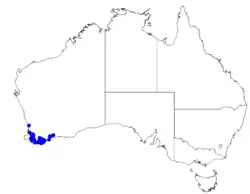 This boronia grows in sandy woodland from Collie to Walpole and east to Esperance in the Avon Wheatbelt, Esperance Plains, Jarrah Forest and Warren biogeographic regions of Western Australia.[2][6]