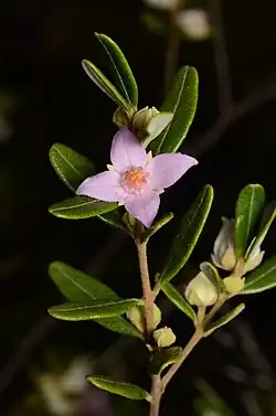 Boronia odorata is an erect, many-branched shrub which grows to a height of 2.0 m (7 ft) with its young branches densely covered with white to reddish brown hairs. Mature plants have simple leaves but the leaves of young plants are trifoliate. Mature leaves and the young leaflets are elliptic in shape, 12–40 mm (0.5–2 in) long and 4–8 mm (0.2–0.3 in) wide and the side leaflets are shorter and narrower. The leaves have a winged petiole 1–8 mm (0.04–0.3 in) long. Up to three pink to white flowers are arranged in leaf axils on a hairy stalk 1–2 mm (0.039–0.079 in) long. The four sepals are egg-shaped to triangular, 2–4.5 mm (0.079–0.18 in) long, 1–2.5 mm (0.039–0.098 in) wide and hairy. The four petals are 6–10 mm (0.24–0.39 in) long, 4–6 mm (0.16–0.24 in) wide and enlarge as the fruit develops. The eight stamens alternate in length, size and shape. Flowering occurs from February to October and the fruit are 5–7 mm (0.20–0.28 in) long and 3–3.5 mm (0.12–0.14 in) wide.[2]