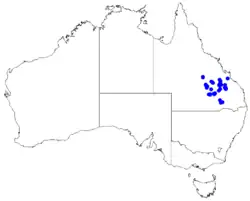 This boronia grows in woodland on sandstone in the central highlands of Queensland in an area bounded by Springsure, Theodore, Surat, Mitchell and Tambo.[2]