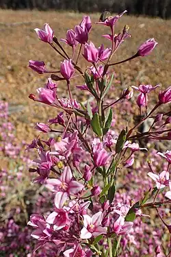 Boronia tenuior is an open, glabrous shrub that typically grows to a height of 1–2 m (3 ft 3 in – 6 ft 7 in). The branchlets are more or less square in outline with a narrow, wavy, glandular wing on each corner. It has simple, elliptic leaves, 10–20 mm (0.39–0.79 in) long with serrated edges. The flowers are arranged in cymes on the ends of the branchlets with large, red bracts at the base. The flowers on the edges of the cymes are borne on a thin, dark red pedicel 7–20 mm (0.28–0.79 in) long. The four sepals are dark red, narrow triangular to egg-shaped and about 2.5 mm (0.098 in) long. The four petals are pink to mauve, darker in the centre and about 6 mm (0.24 in) long. There are eight stamens with a warty tip and hairy. Flowering mainly occurs between October and January.[2][3]